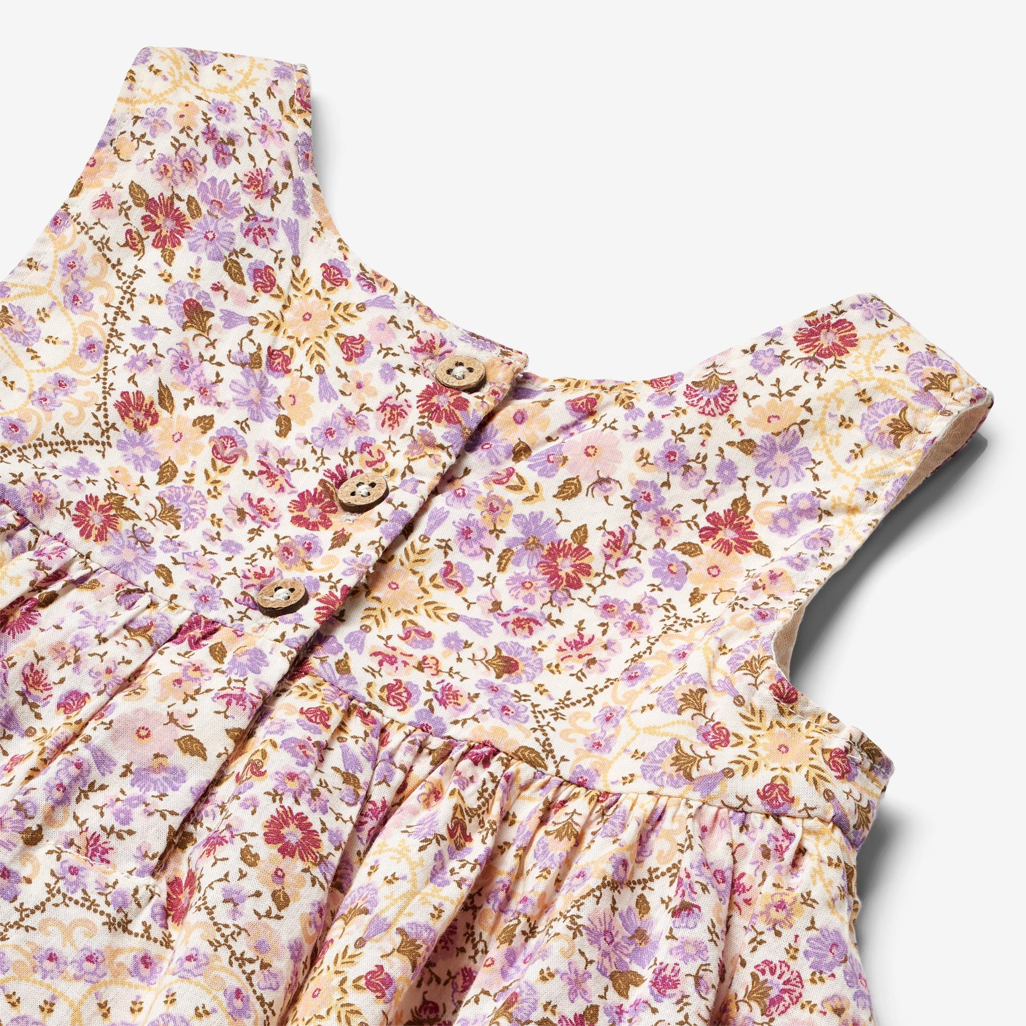 Sleeveless dress with print in soft woven organic cotton for babies.